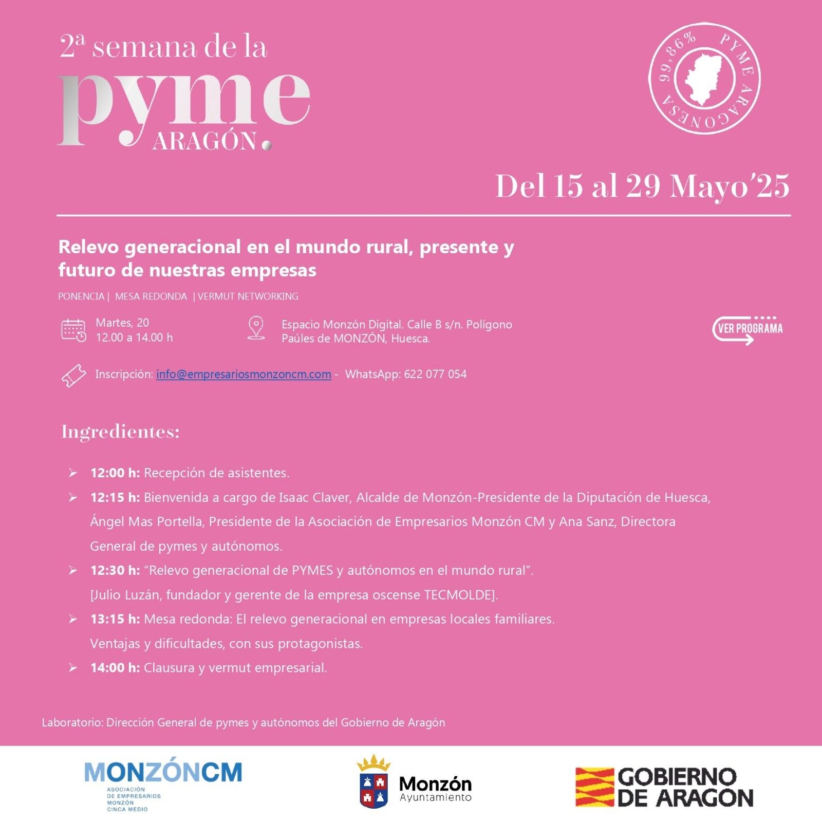 La jornada de entrada libre y gratuita para empresarios, abierta también a todos los interesados en el tema y los ponentes participantes. Está promovida por la Dirección general de pymes y autónomos del Gobierno de Aragón en colaboración con la Asociación de empresarios Monzón Cinca Medio y el Ayuntamiento de Monzón, contará con la presencia de: Ana Sanz, directora general de Pymes y autónomos de Aragón e Isaac Claver, alcalde de Monzón y presidente de la DPH.